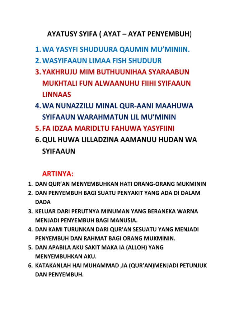 ENAM AYAT SYIFA PENYEMBUH DALAM AL-QURAN. Yaa ayyuhaan-naasu qad jaa atkum mawizhatum mir-rabbikum wa syifaa-ul-limaa fish-shuduuri wa hudaw wa rahmatul-lil muminiin Artinya. Ayat Syifa Penyembuh Penyakit Yang dimaksud dengan ayat syifa adalah beberapa ayat tertentu dalam Quran yang dikhususkan untuk menyembuhkan penyakit sebagai penawar.