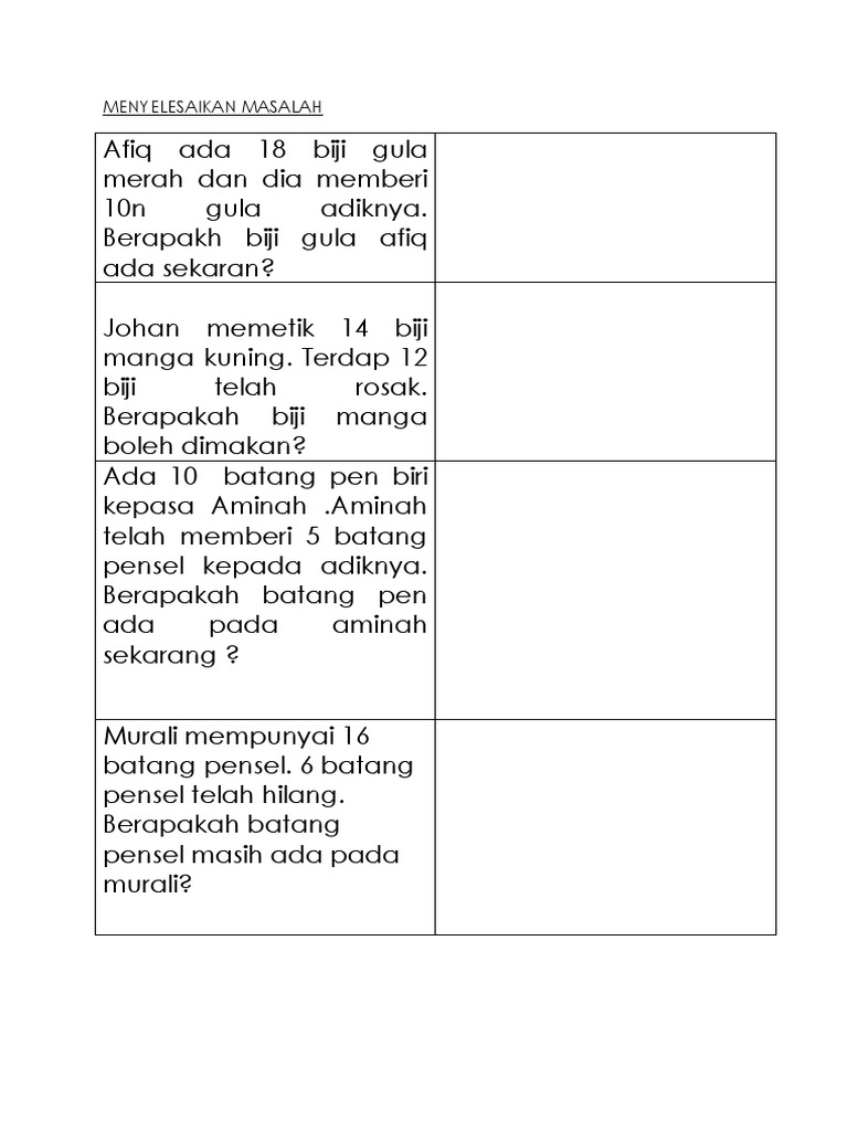 Misalnya Menentukan urutan langkah-langkah kerja yang perlu dilakukan bagi menyelesaikan suatu pendaraban. 5 Boleh menggunakan alat matematik bagi menyelesaikan masalah yang rutin dengan menggunakan pelbagai strategi. Berapakah bilangan gula-gula di dalam 4 buah kotak yang sama.